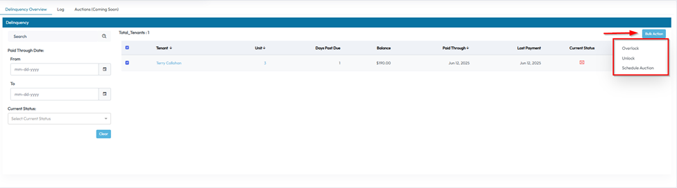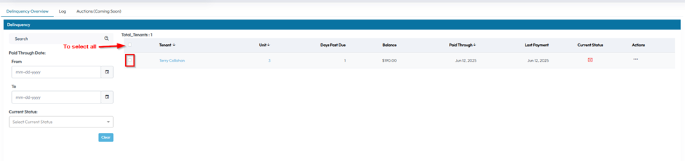The Delinquency tab helps you monitor and manage tenants who are past due on their payments. It provides tools for identifying delinquent tenants and taking action in bulk when necessary.