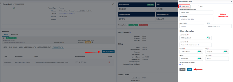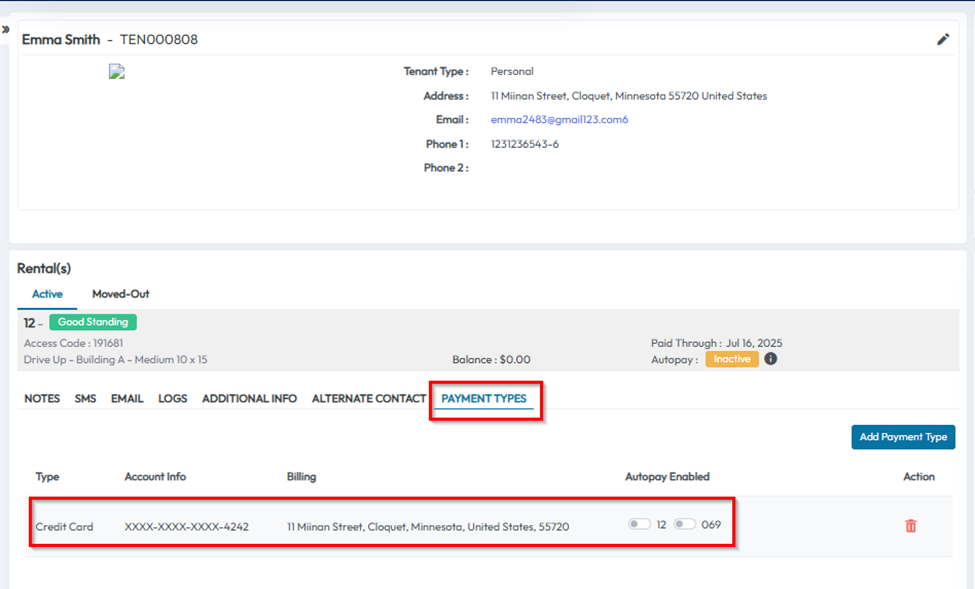 - In the tenant profile, locate the Payment Types section on the left side under Rental Information