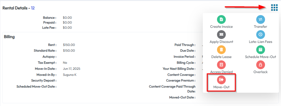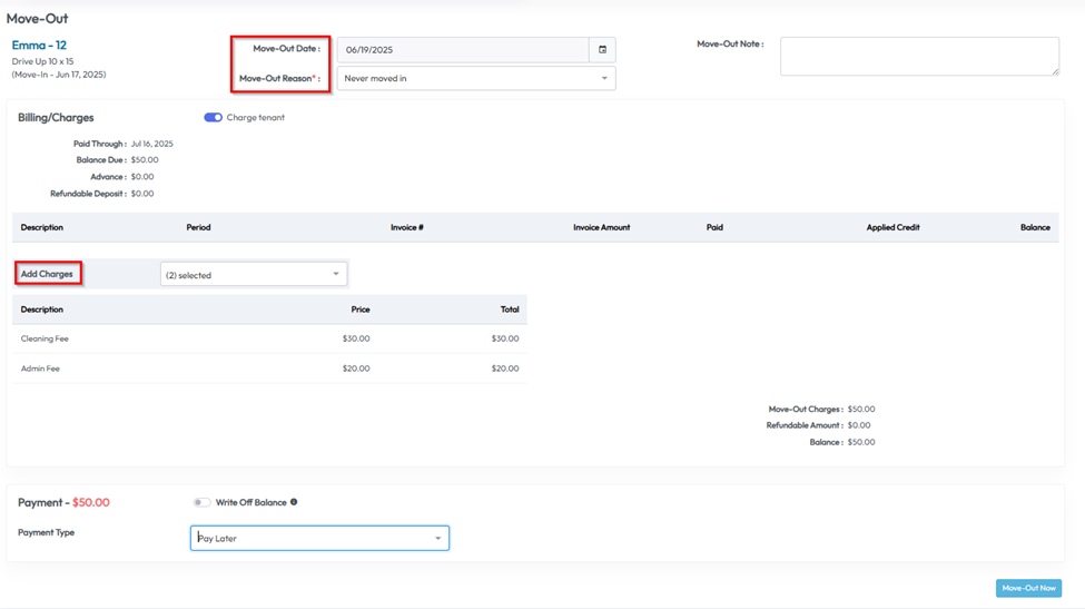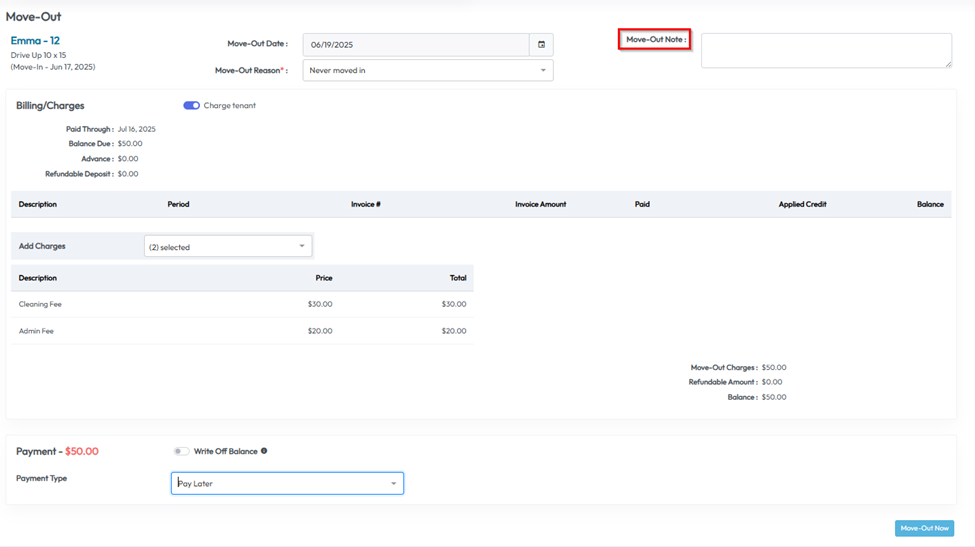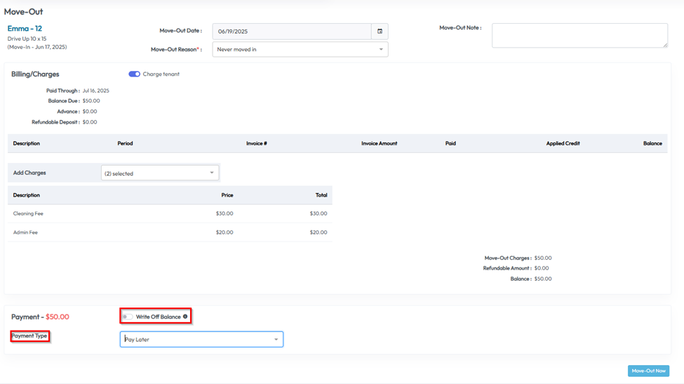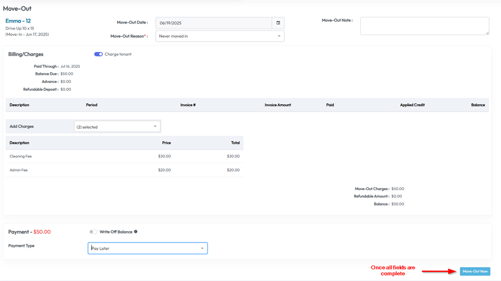 Once all details are confirmed and any balance has been handled, click Move Out Now to finalize the process.