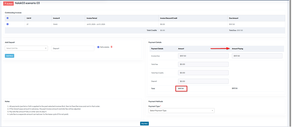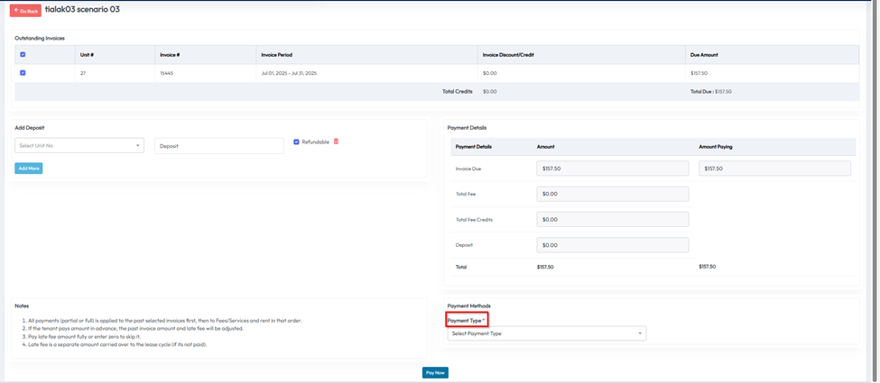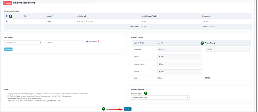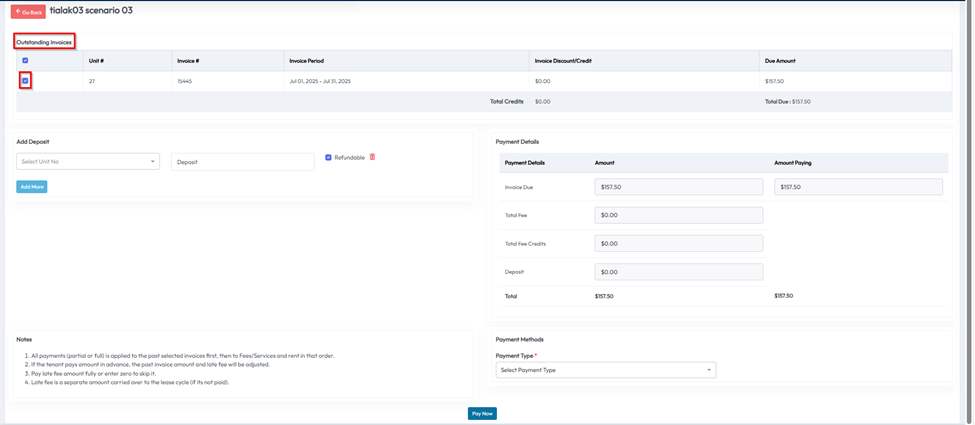 After clicking Pay Now, a list of the tenant’s outstanding invoices will appear: