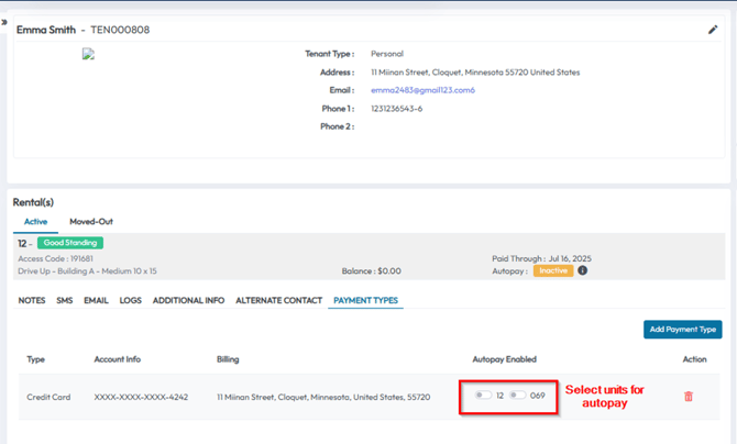 - Once the payment method is added, a list of the tenant’s current units will appear