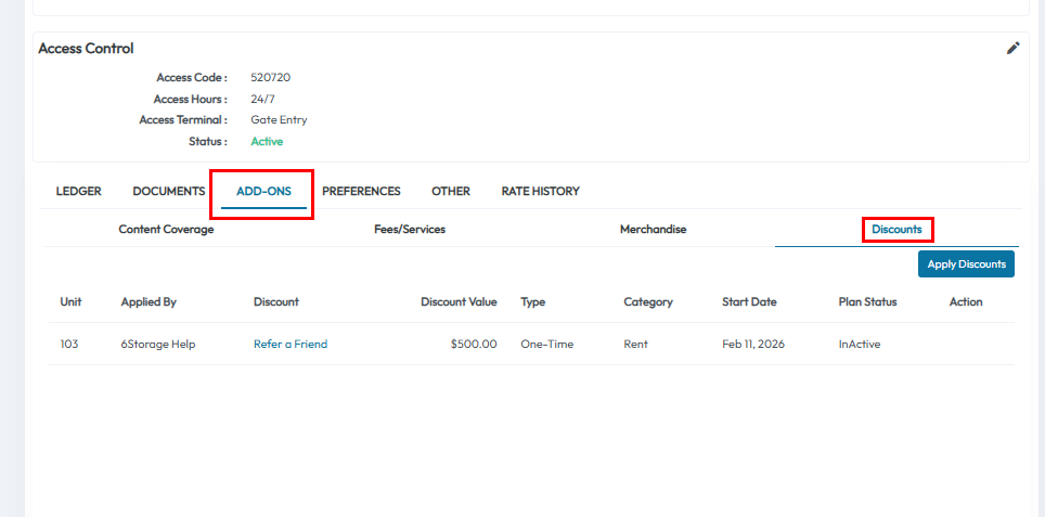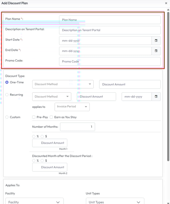 - All discount plans can be restricted to specific Facilities, Unit Types, Unit Groups, Tenant Types, and Line Items