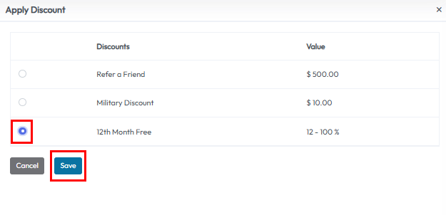 Note: You can also apply discount plans to new tenants during the move-in process. When selecting billing and pricing options, simply choose the desired discount plan before completing the rental.