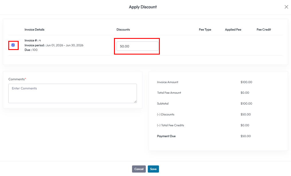 Sometimes you may want to give a tenant a one-time discount without creating a plan.