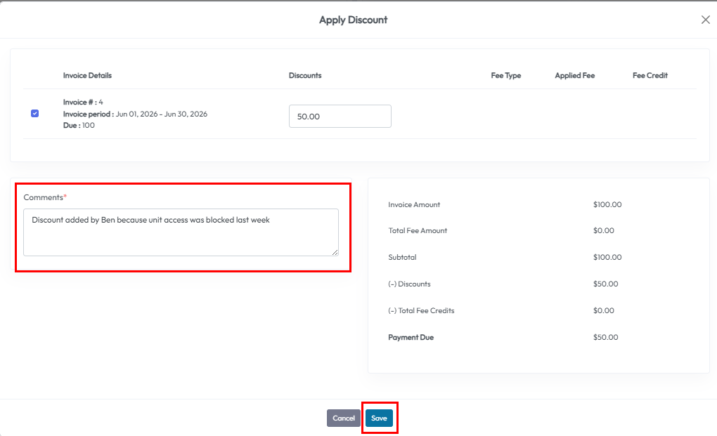 - The discount will be applied, and the tenant’s balance will be adjusted accordingly