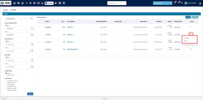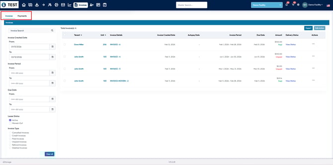 The Invoices tab allows you to view all invoices and receipts created for your tenants. Follow the steps below to navigate and utilize this section efficiently.