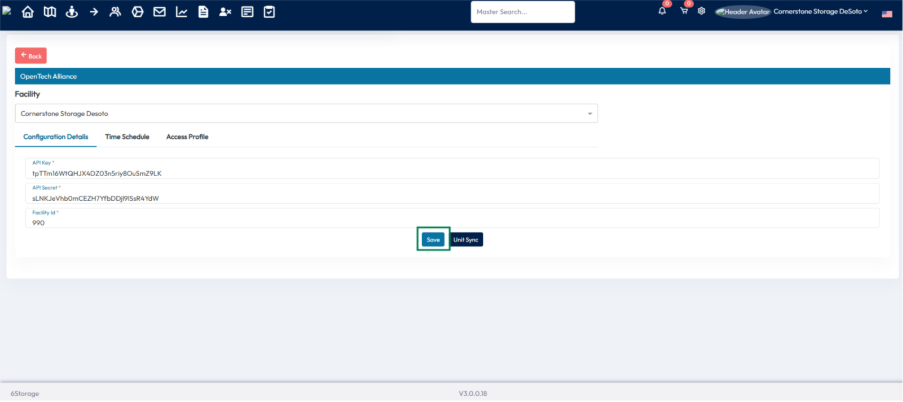 4. Enter the API Key, API Secret Key, and Facility ID provided by the OpenTech Alliance technical team.