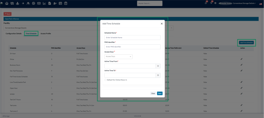 Once saved, the Time Schedules (Access Hours) and Access Profiles (Keypads) created in OpenTech Alliance console are synced and available in 6Storage.
