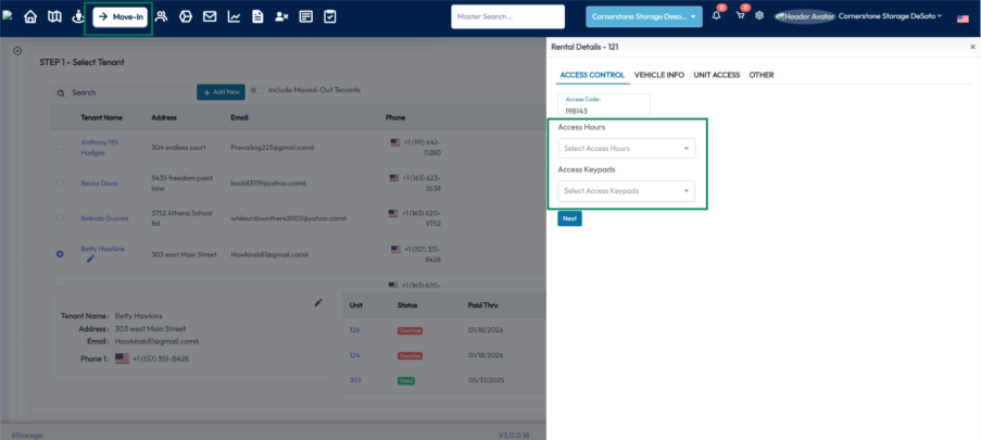 When integrated with OpenTech Alliance, the Access Hours and Access Keypads fields display the available Time Schedules and Access Profiles during tenant move-in. One Time Schedule or Access Profile can be selected for each field.