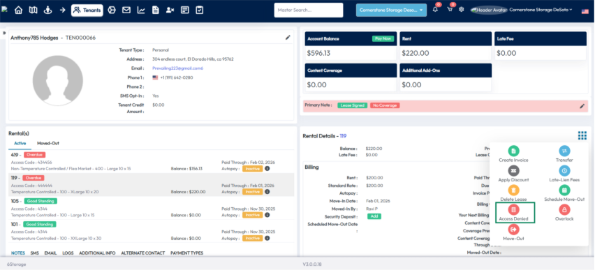Clicking the Access Denied button disables all access. The unit status in OpenTech Alliance is then updated to Delinquent.
