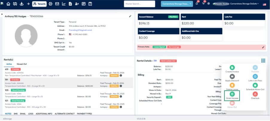 Clicking the Grant Access button reactivates access for a locked out tenant. The unit status in OpenTech Alliance is then updated to Rented.