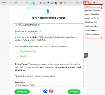 • Selecting the Tenant First Name tag will add <%%tenantfirstname%%> to the template