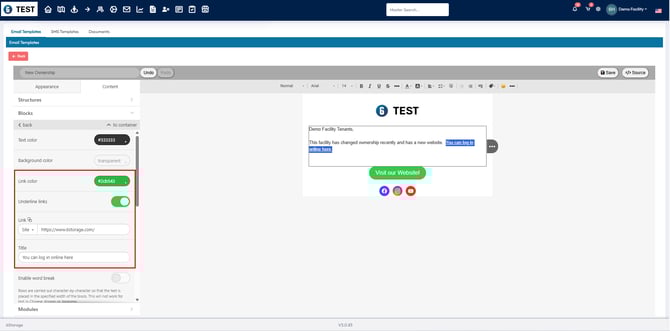 - This will open the options on the left to insert the link and change the Link color as well