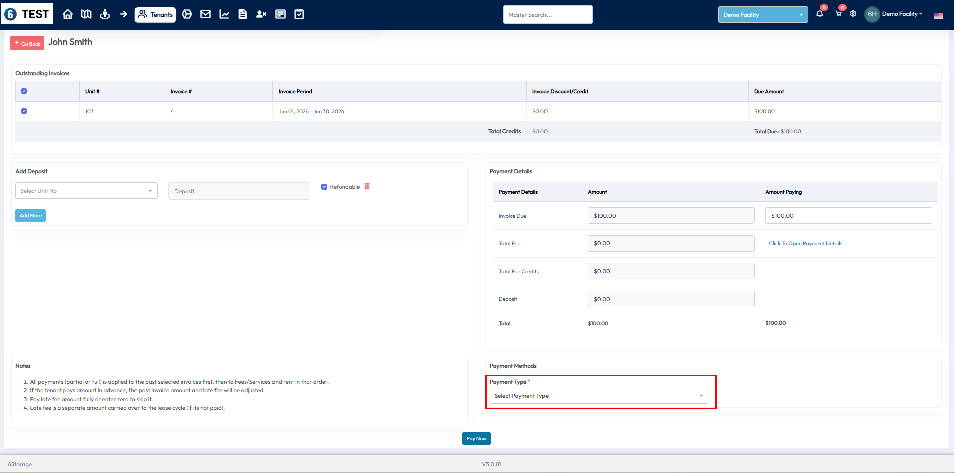 At the bottom of the screen, use the Payment Type dropdown to choose how the tenant is paying: