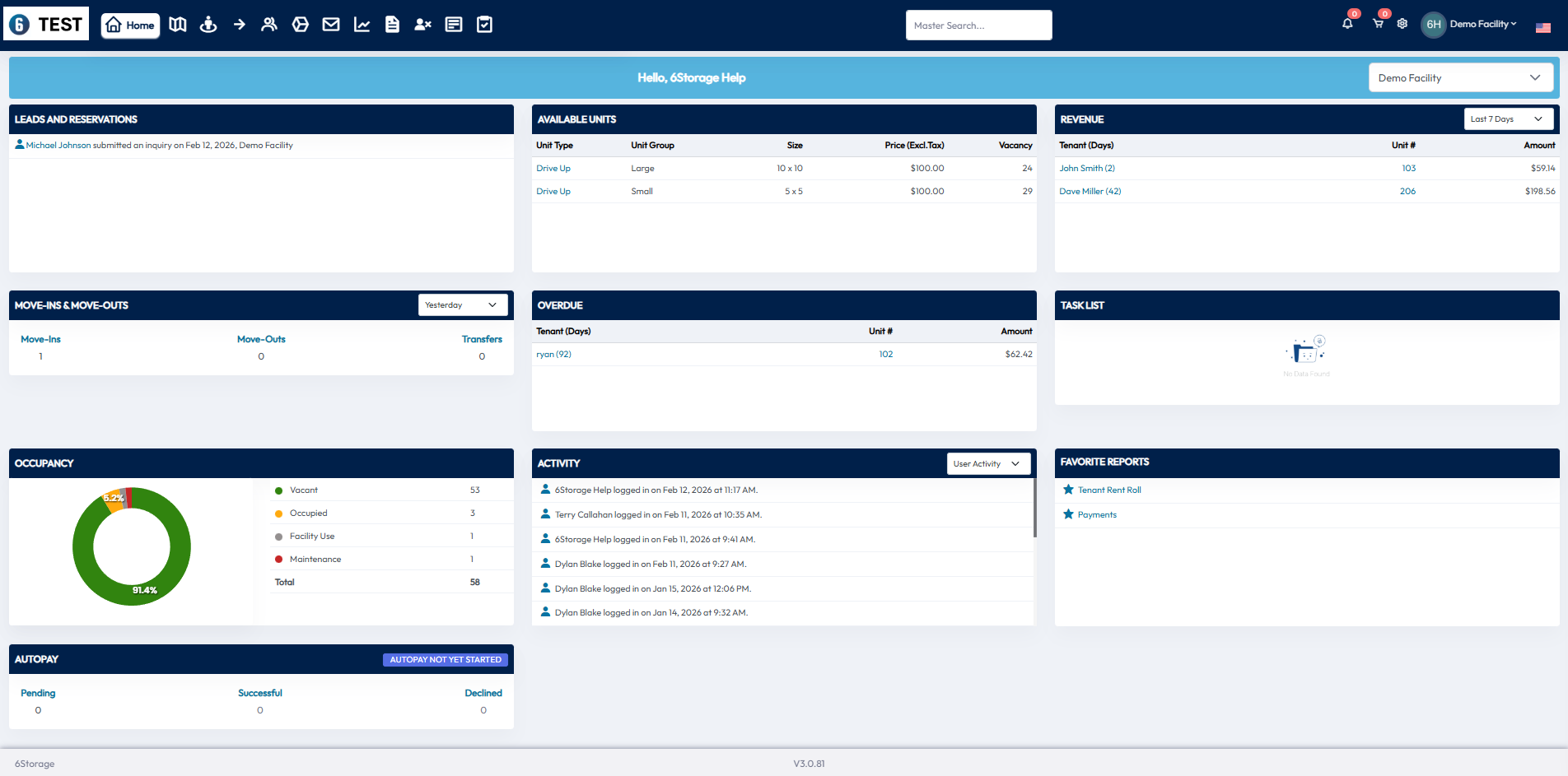The dashboard is designed to give a quick overview of many aspects of your facility. There are a variety of widgets to give operators a look into various parts of their business.