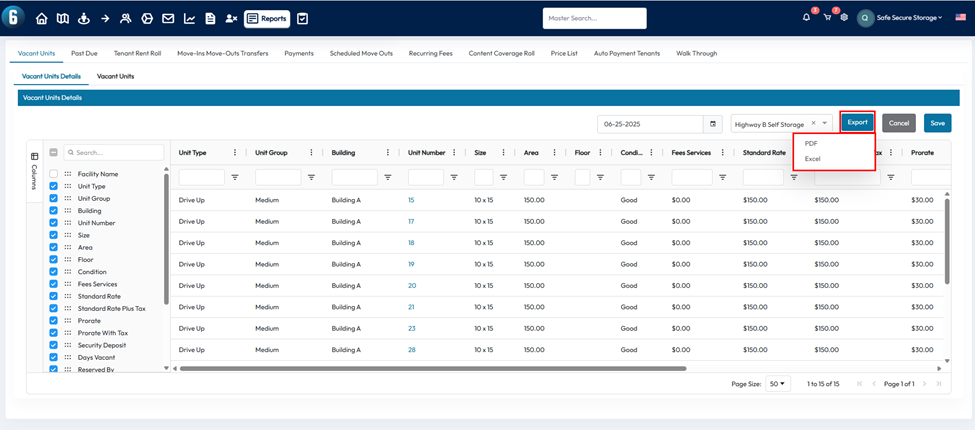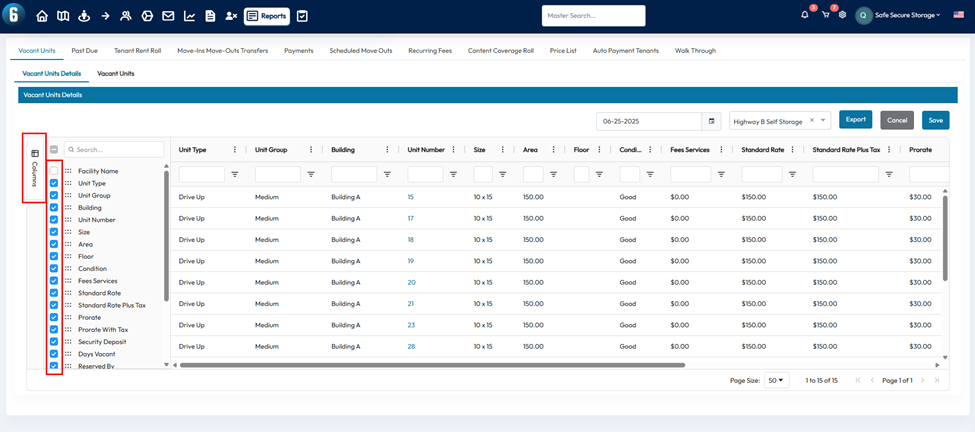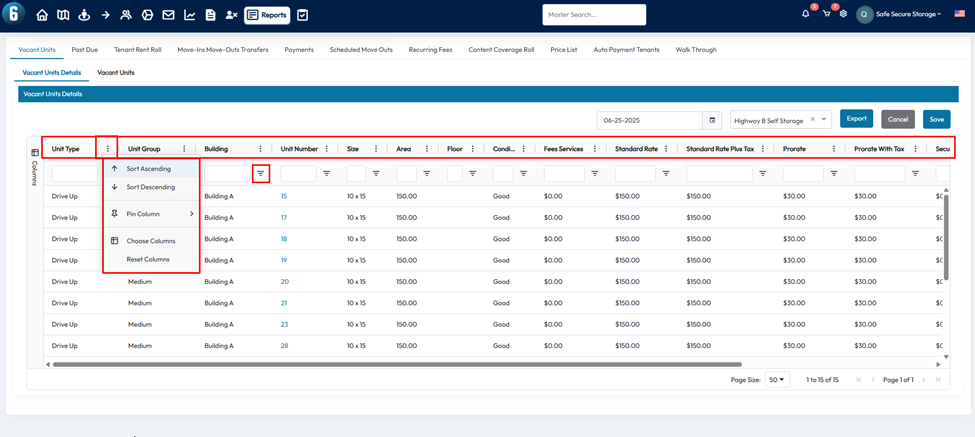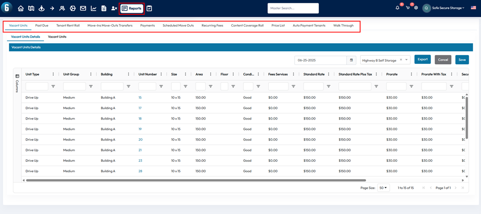 The Reports section in the 6Storage admin portal gives you access to important data about your facility’s performance. Once inside a report, you can customize the view, sort information, and export data depending on your needs.