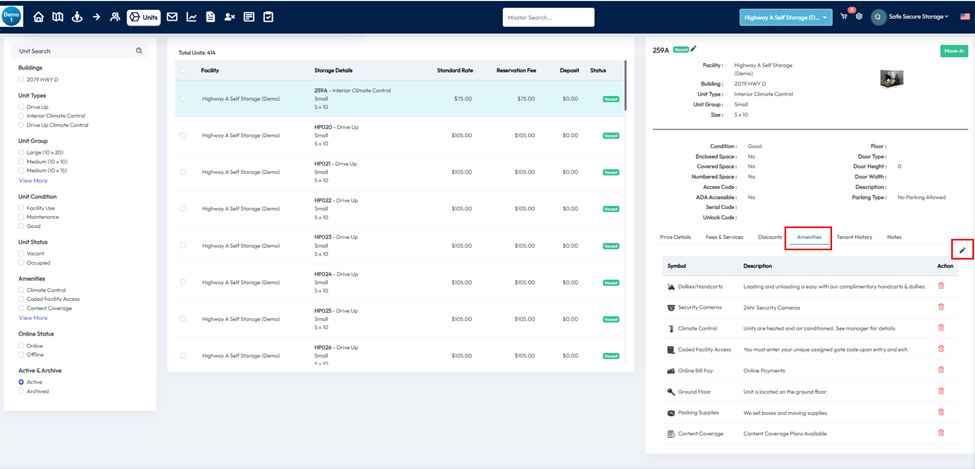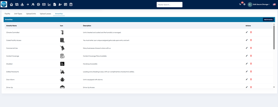 These are traits that you can assign to each unit to tell a little bit more about them. For example, your Climate Control units have air conditioning, so you can assign them the Climate Control amenity to the unit and display it to potential tenants. You can add an Amenity by clicking the Add Amenity button on the upper right side of the screen. You can also edit the existing Amenities by clicking the edit pencil under Actions.